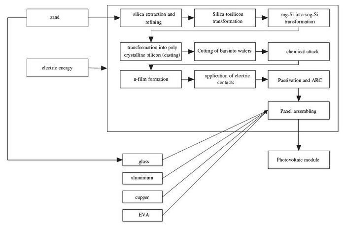 ייצור פוטו-וולטאים הוא הצעד האינטנסיבי ביותר במודולי PV המותקנים באופן מכריע. כפי שניתן לראות באיור 2, כמויות גדולות של אנרגיה משמשות להמרת חול סיליקה לסיליקון הטוהר הגבוה הנדרש לפלים פוטו-וולטאים. הרכבת מודולי ה- PV היא צעד נוסף עתיר משאבים עם תוספת של מסגרות אלומיניום בעלות אנרגיה גבוהה וגגות זכוכית.